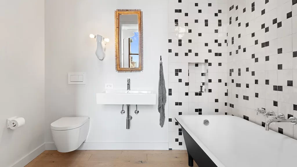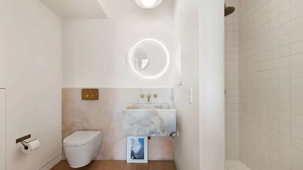A massive pivot door leads to the primary bedroom, where a Zucchetti soaking tub and bold black-and-white tile elevate the ensuite bath. The walk-in closet provides ample storage, while a mezzanine guest room—tucked above the entry—doubles as a creative office or studio. Below it, hidden storage and mechanical systems keep the space clutter-free. A serene guest bath features a light-pink onyx marble wall and walk-in shower.