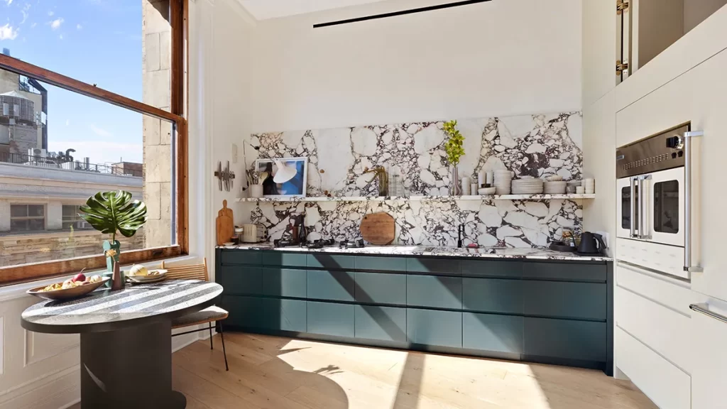 Working with acclaimed architect Elizabeth Roberts, Huisman transformed the loft into a light-filled retreat. Seven original oak-framed windows flood the open living area with natural light, highlighting the 12-foot ceilings and 37-foot length of the main room. Calacatta Viola marble counters and a dramatic backsplash anchor the sleek, minimalist kitchen, which is outfitted with a PITT Cooking stove and Blue Star oven.