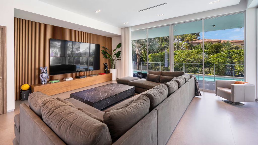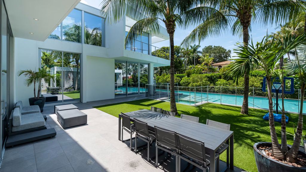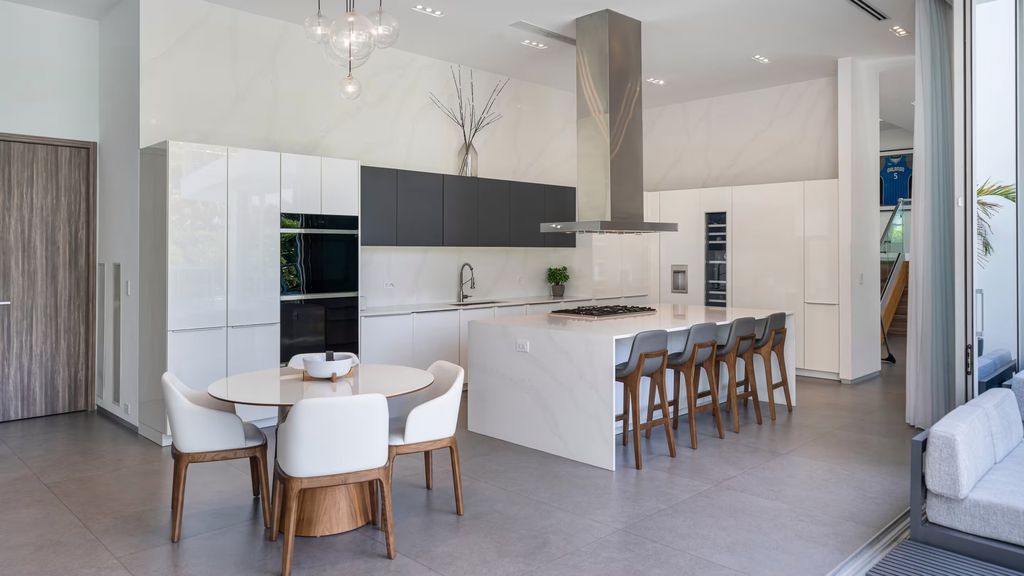 Oladipo’s former home sits on a rare oversized corner lot and spans nearly 6,500 square feet. Wrapped in glass and designed with a light-filled open floor plan, the property offers a larger footprint than most homes on the man-made island.