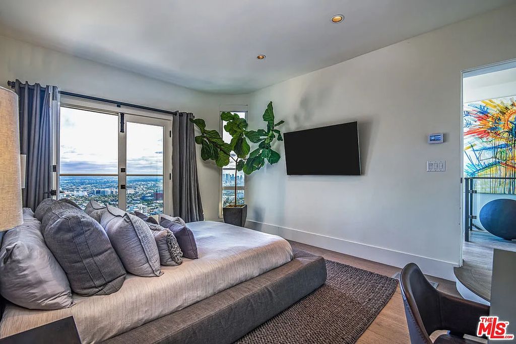 Upstairs, the primary suite in the Nicole Scherzinger Hollywood Hills home feels suspended above Los Angeles. Retractable glass walls open to uninterrupted views of the basin, while a built-in fireplace and minimalist furnishings maintain a serene atmosphere.