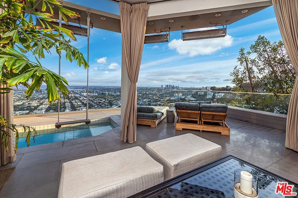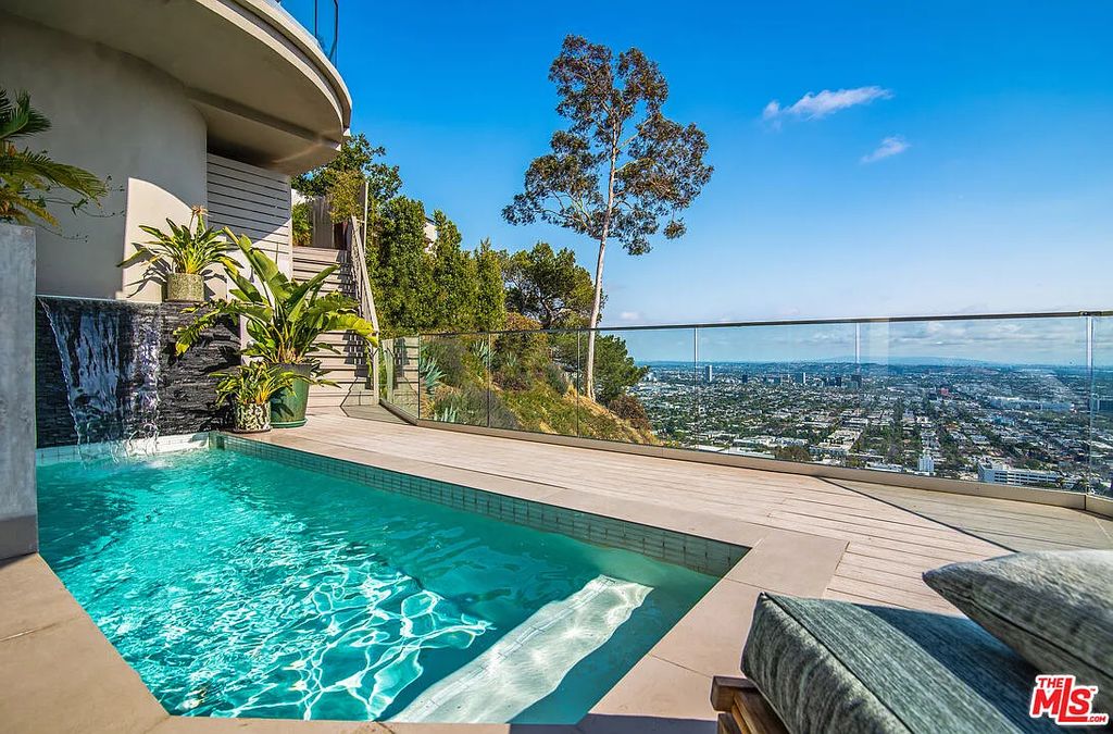 Outdoor spaces remain central to the appeal of the Nicole Scherzinger Hollywood Hills home. A plunge pool with a cascading waterfall feature sits against a glass railing that preserves unobstructed sightlines toward Downtown and the Pacific. Lush landscaping introduces a tropical softness that contrasts with the home’s modern geometry.