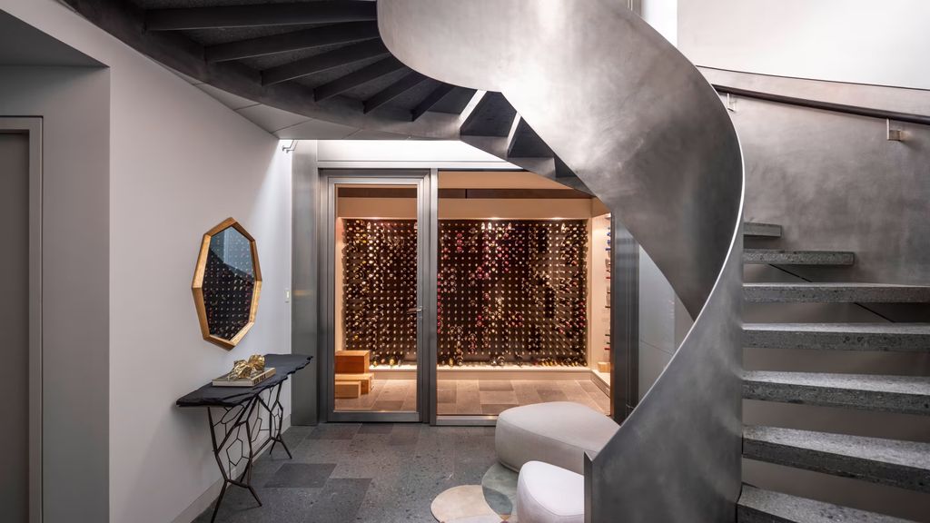 Spanning approximately 7,470 square feet, the home unfolds across three levels, unified by a sculptural spiral staircase that serves as both a functional element and a work of art. Crafted from stone and steel, the staircase introduces a sense of movement and contrast within the home’s otherwise linear geometry.