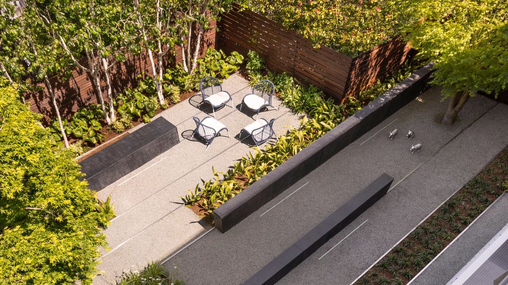 The lower level of the home introduces a more intimate connection to the outdoors. Two additional bedrooms open directly onto a landscaped backyard, where an award-winning garden designed by Andrea Cochran creates a tranquil escape from the city.
