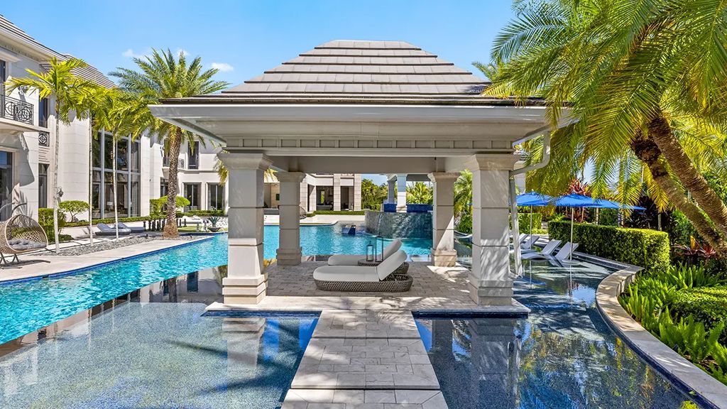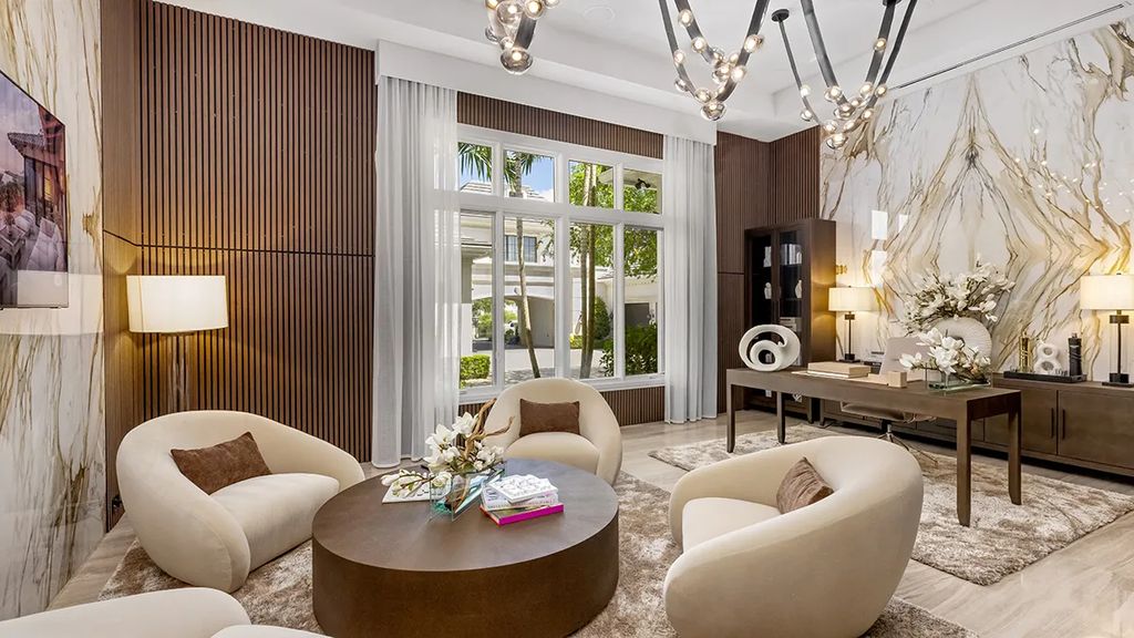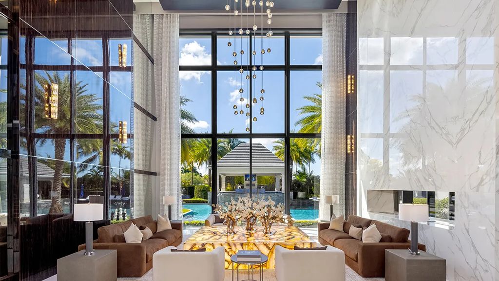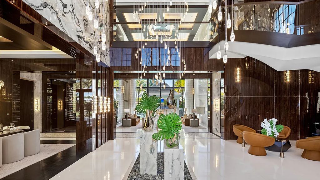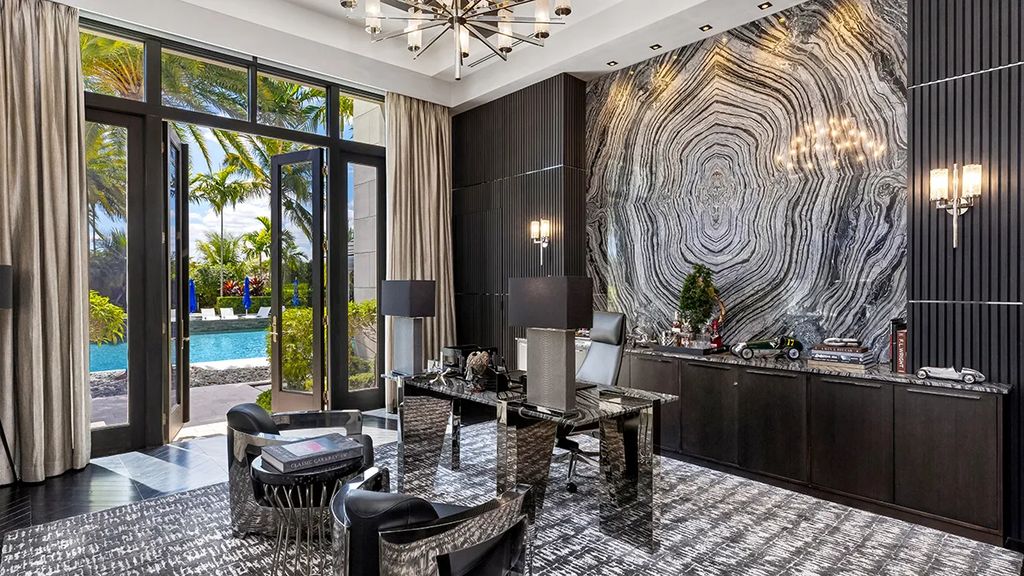 Palazzo di Lago exemplifies Mediterranean-inspired design with modern sensibilities. Its grand entrance, featuring a double staircase and floor-to-ceiling marble panels, immediately conveys luxury. Expansive windows frame views of the landscaped grounds and the saltwater lagoon pool, allowing natural light to flow throughout the living spaces. The interiors are adorned with imported materials such as Italian gray marble, walnut cabinetry, and lacquered wood finishes, while floors in the master suite incorporate mother-of-pearl inlays.