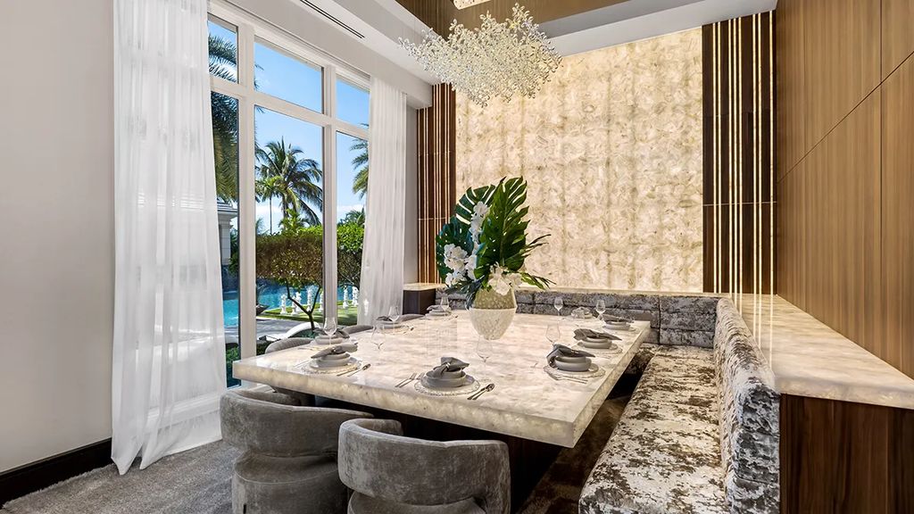 The chef’s kitchen, outfitted with high-end appliances and generous workspace, is designed for both daily living and large-scale entertaining. A separate dining room overlooks the private gardens, creating an indoor-outdoor connection that is a hallmark of South Florida estate design. The listing agent further noted to californialuxuryhouses, “Every detail, from material selection to spatial planning, was intended to provide a luxurious yet comfortable environment for the family.”