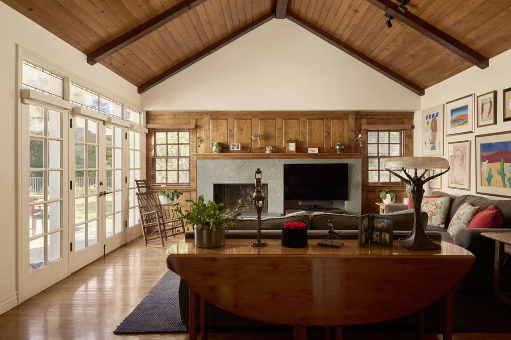 One of the most inviting areas of the Patricia Richardson Brentwood home is the main-level primary suite. Designed as a private retreat, the bedroom features vaulted ceilings, exposed beams, and a carved wood fireplace that echoes the craftsmanship seen throughout the property.