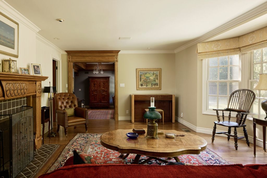Just beyond the foyer, the formal living room reveals the timeless character that defines much of the Patricia Richardson Brentwood home. The space centers around a carved wood fireplace framed by detailed millwork, while large windows allow natural light to fill the room throughout the day.