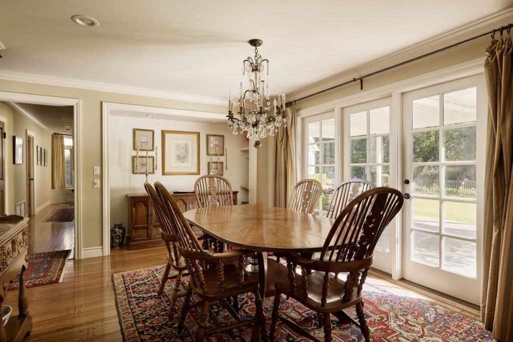 Moving deeper into the residence, the formal dining room continues the traditional aesthetic. French doors open directly to the backyard gardens, creating a seamless indoor-outdoor connection that is characteristic of many Westside estates.