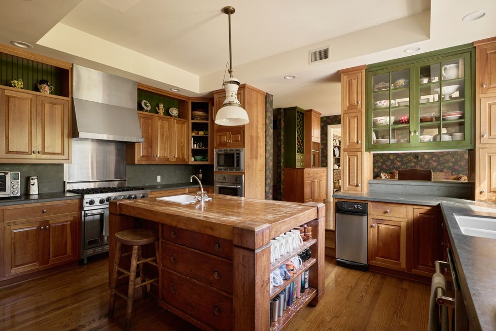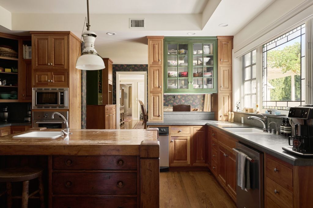 At the center of the Patricia Richardson Brentwood home, the kitchen introduces a more relaxed environment designed for everyday life. A butcher-block island anchors the room, surrounded by warm wood cabinetry and green-painted accents that lend a nostalgic touch.