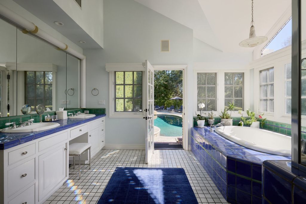 The suite’s bathroom introduces a bold design moment with vibrant blue and green tilework surrounding a soaking tub and walk-in shower. Dual vanities provide additional space, while a door leading directly to the pool area makes it easy to transition between indoor comfort and outdoor relaxation.