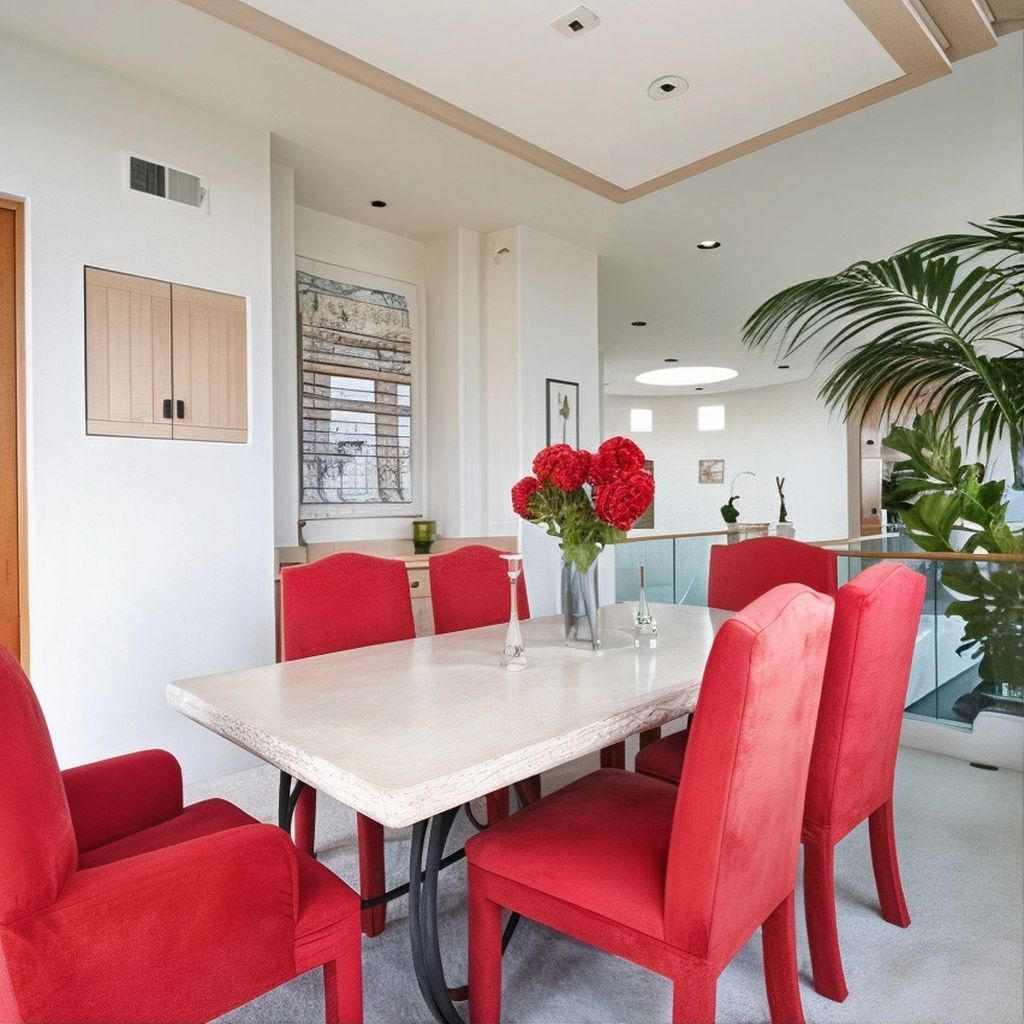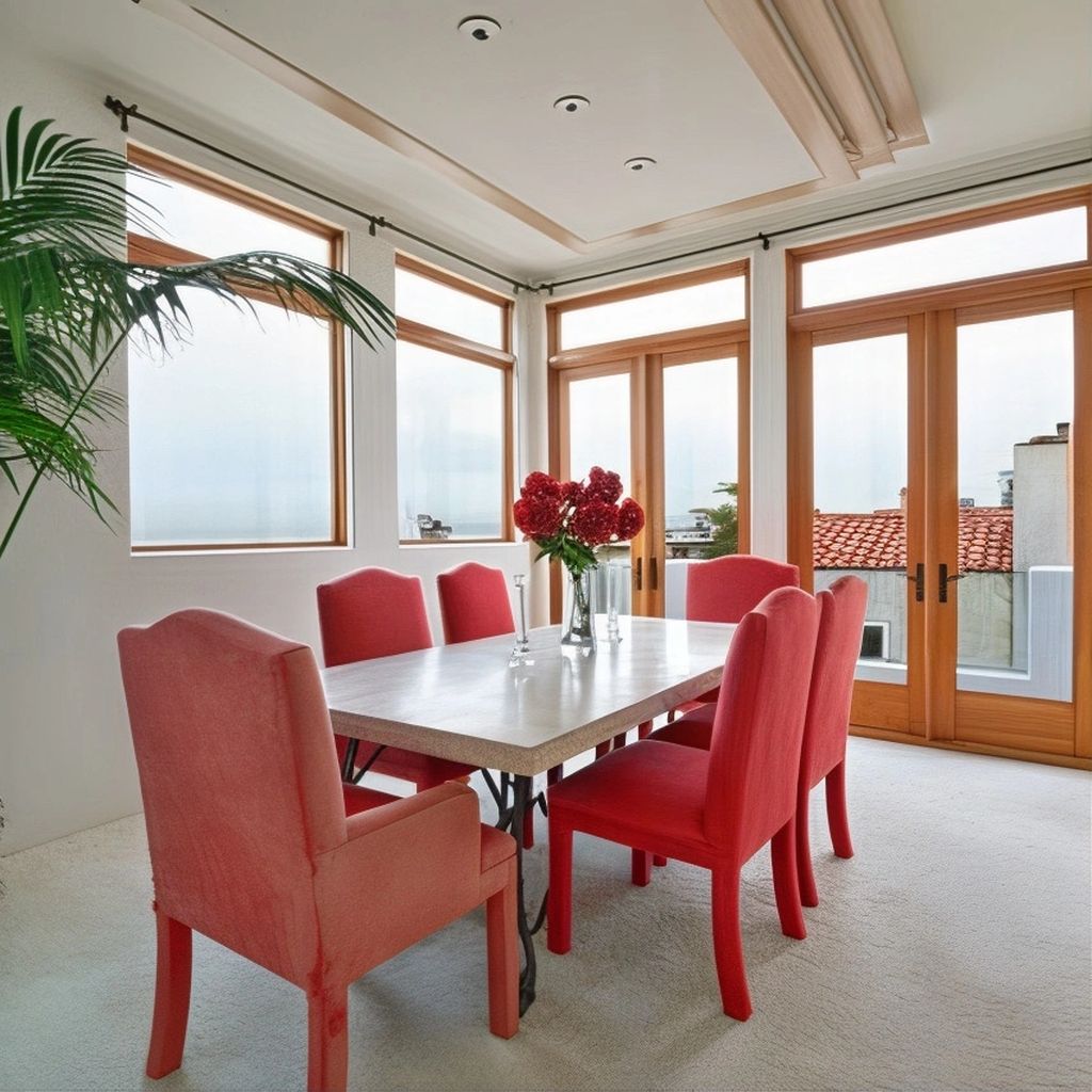 Custom cabinetry in a matte finish conceals storage while maintaining a clean, modern profile. Under-cabinet lighting and pendant fixtures provide ambient and task illumination. The adjacent dining area is positioned beneath clerestory windows, bathing the space in sunlight and offering views of the courtyard garden beyond. Whether hosting guests or enjoying a quiet meal, the kitchen serves as a seamless extension of the home’s easygoing yet refined atmosphere.