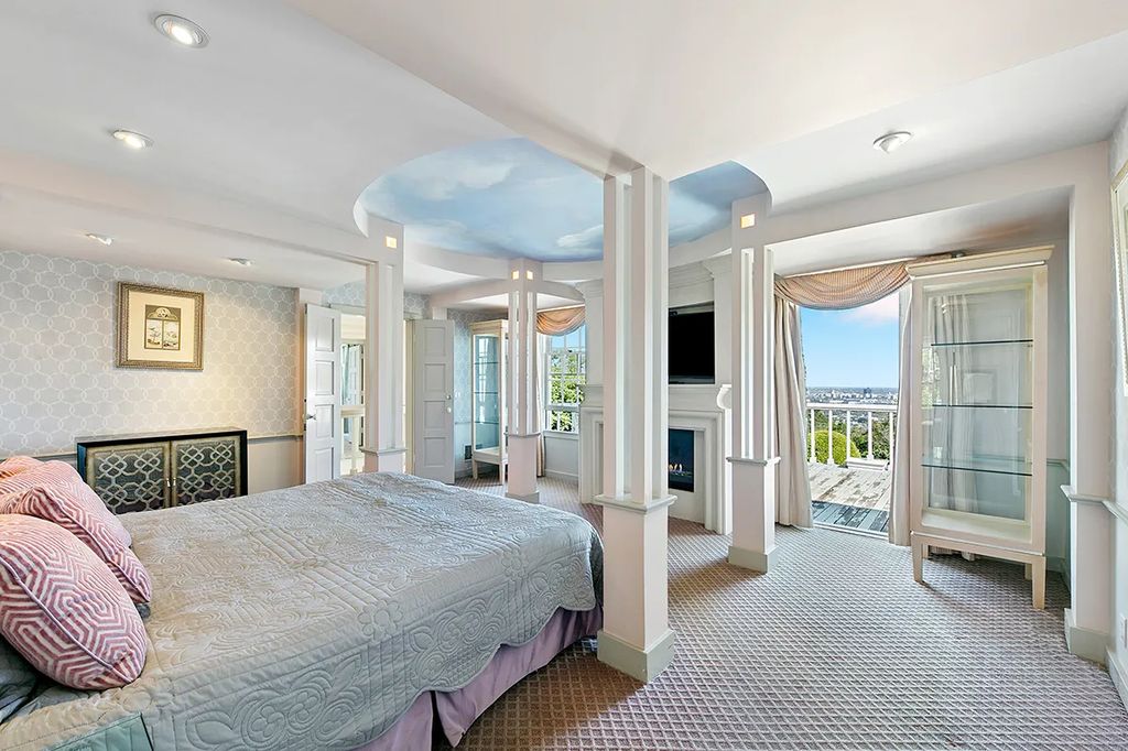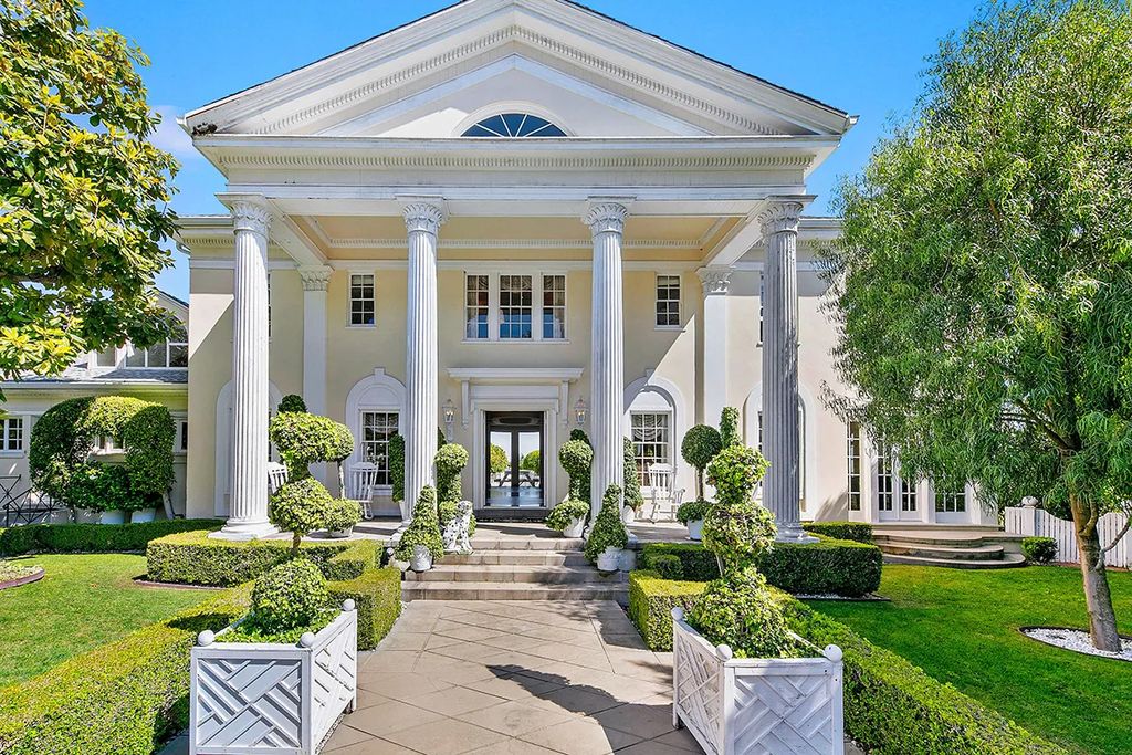 Hidden behind gates on a half-acre hillside lot, the cream-and-white home welcomes guests with a stately columned portico. Inside, elegant details flow from a living room with a two-way fireplace to a music room filled with natural light. A formal dining area and Thermador-equipped kitchen provide a stylish setting for entertaining.