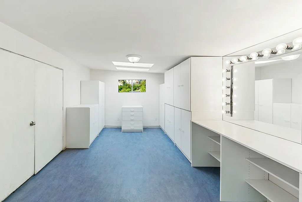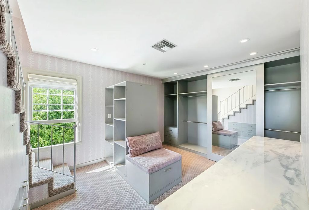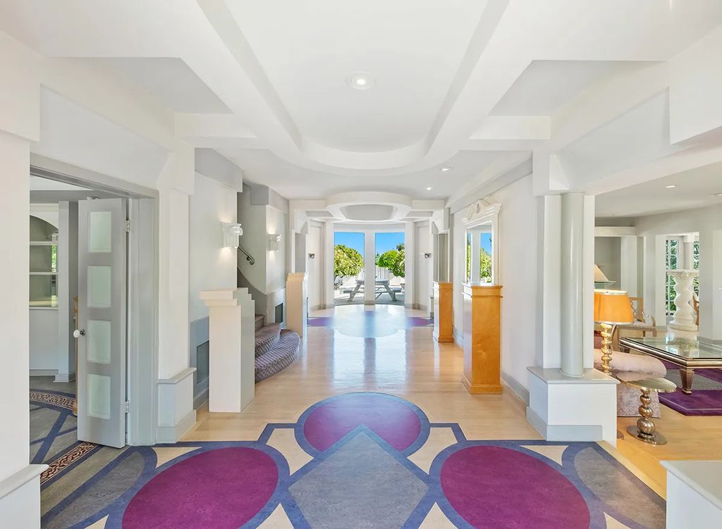 Upstairs, a pink-carpeted staircase with painted cherubs leads to the showstopping four-room primary suite. Highlights include a fireside bedroom, Juliette balcony, spa-inspired bath, and a private gym still outfitted with Simmons’s Keiser equipment. “Richard treated his home as both a sanctuary and a studio,” listing agent John A. Lucy told californialuxuryhouses, adding that “its energy remains unforgettable.”