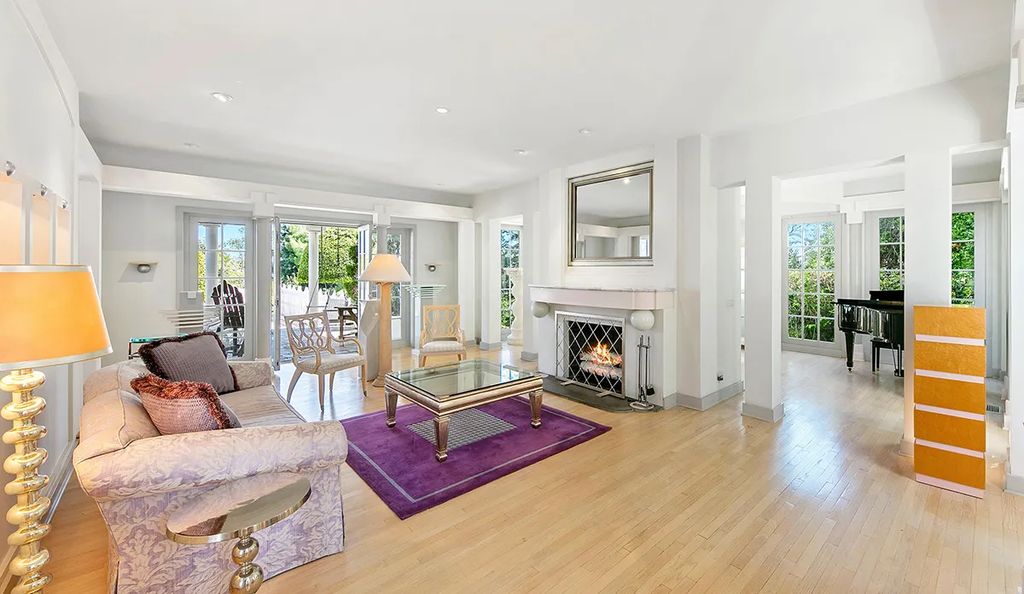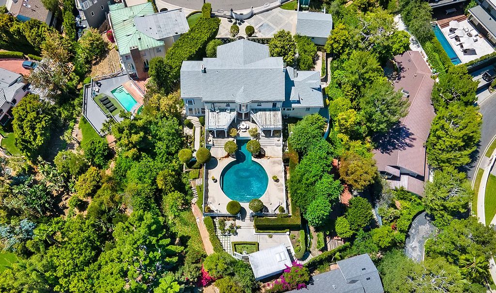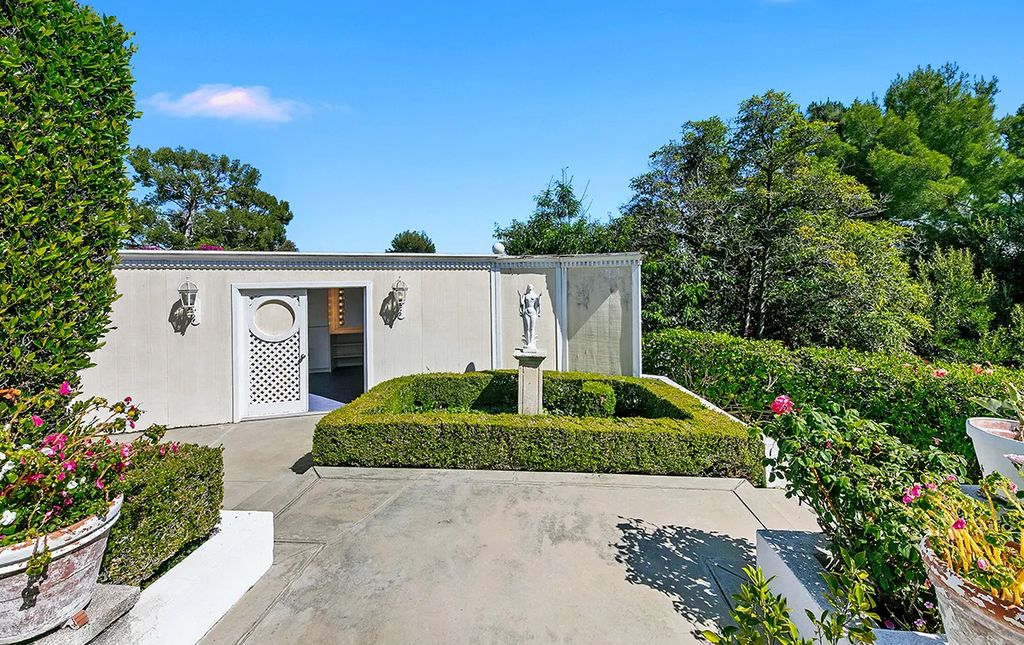 Beyond the expansive veranda, manicured gardens frame a circular pool and charming pool house. Mature landscaping ensures privacy, while a detached two-car garage completes the property. “This home captures the essence of Hollywood Hills living,” Lucy shared with californialuxuryhouses, calling it “a rare blend of history and modern comfort.”