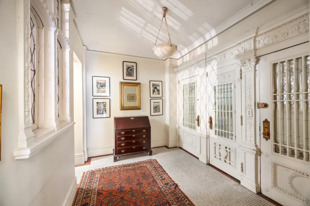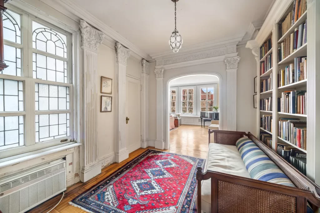 Inside, the roughly 2,700-square-foot apartment reflects an architectural integrity rarely preserved in today’s luxury market. The semi-private elevator landing opens to a gracious foyer lined with original leaded glass windows. The gallery leads naturally into the expansive living room, where south-facing windows frame uninterrupted views of the museum’s domed roof and surrounding treetops. Light pours into the room, highlighting the prewar moldings and wood-burning fireplace—an inviting reminder of the city’s bygone elegance.