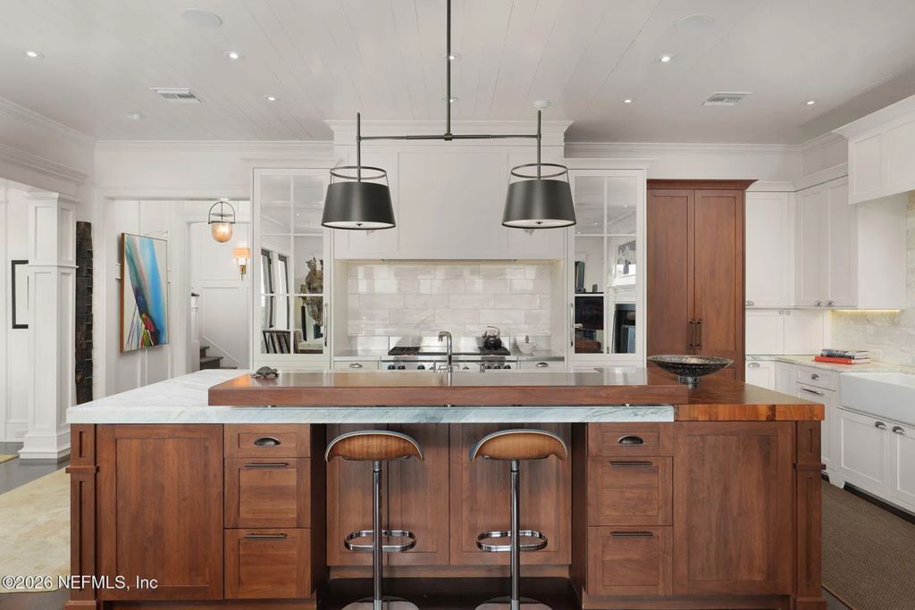 Oversized black pendant lights hang above the island, drawing attention to the paneled ceiling and reinforcing the home’s vertical dimension. Along the perimeter, white and mirrored cabinetry frames professional-grade appliances and a stone backsplash, while wide-plank heart-of-pine flooring introduces warmth and contrast.