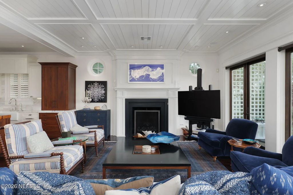 The living room expands beyond the dining area, forming the core of the home’s entertainment spaces. A coffered ceiling with recessed lighting stretches overhead, while a central fireplace framed in white millwork anchors the room. Round windows introduce filtered light, adding architectural character without overwhelming the space.