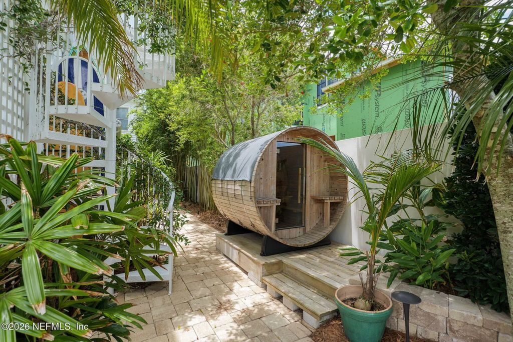 A barrel-style sauna introduces a wellness element, aligning with broader trends in Florida real estate that emphasize health and relaxation. At the edge of the property, a private dock constructed with durable materials offers immediate access to the Intracoastal waterway, complete with boat and jet ski lifts.