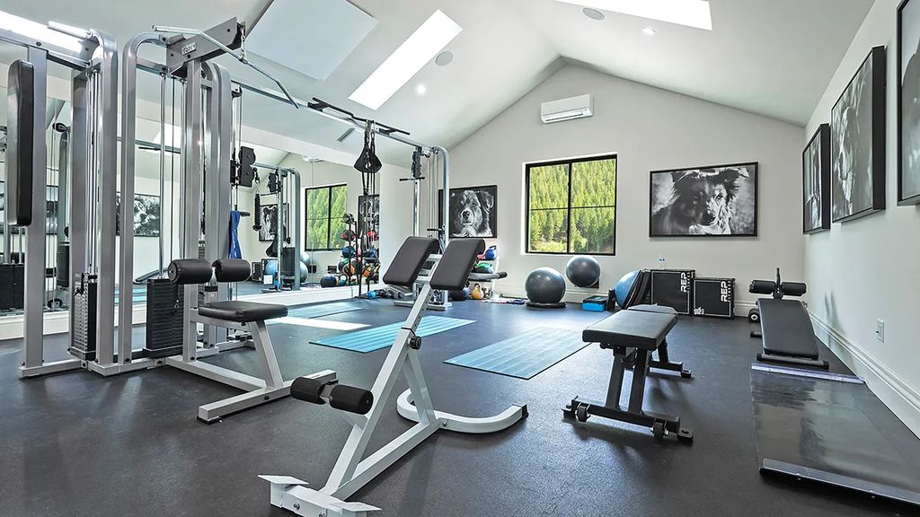 The 260-acre property extends well beyond the walls of the house. A fully heated barn reflects the same meticulous attention to detail, containing four horse stalls, dedicated tack and feed rooms, and an office. Upstairs, a second-level gym provides fitness options year-round and can easily convert into a guest suite. Outside, pastures stretch toward the East Fork River, bordered by aspen and willow groves. Several stocked ponds and a professional-grade equestrian arena complete the picture of an estate designed for both recreation and quiet retreat.