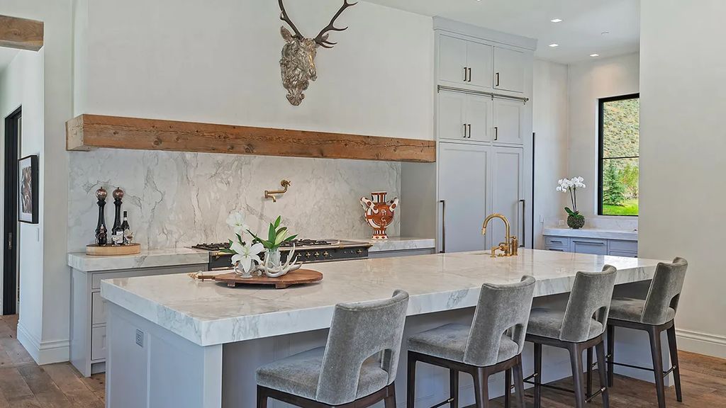 Completed in 2021, the four-bedroom, four-and-a-half-bath main residence celebrates refined Western craftsmanship while embracing international influences. Reclaimed wide-plank wood floors and clay-wash plaster walls provide an earthy palette that is elevated by hand-hewn oak beams. Overhead, sculptural Apparatus light fixtures and delicate Murano glass chandeliers create a gallery-like atmosphere. The great room is anchored by a French limestone fireplace, a feature Fox describes to californialuxuryhouses as “a hearth that functions as sculpture, balancing rustic Idaho charm with European elegance.”