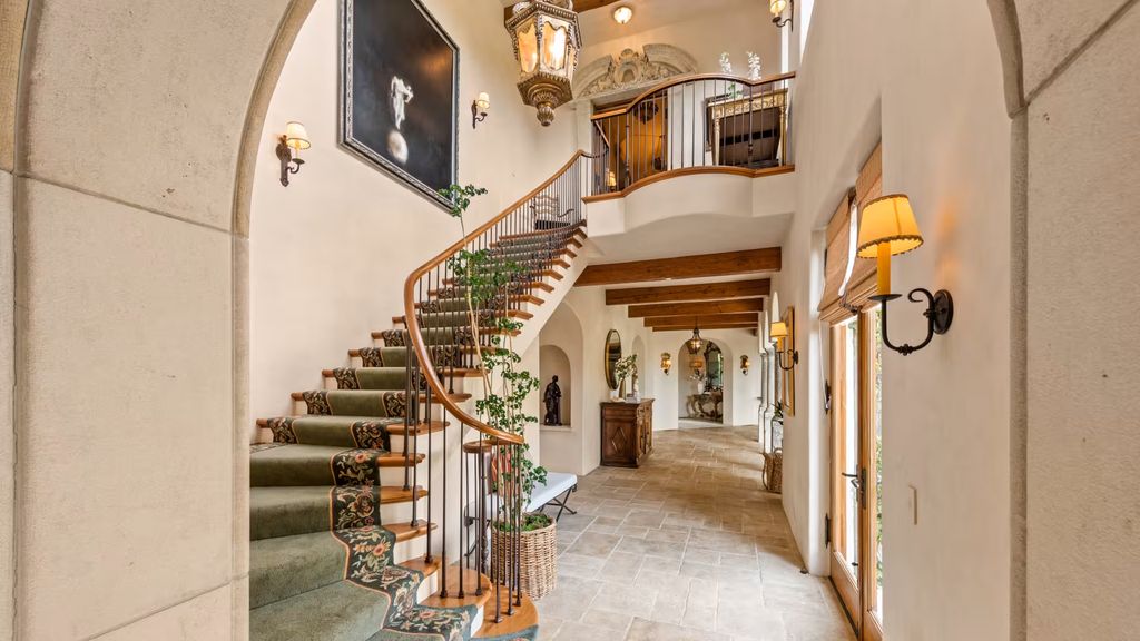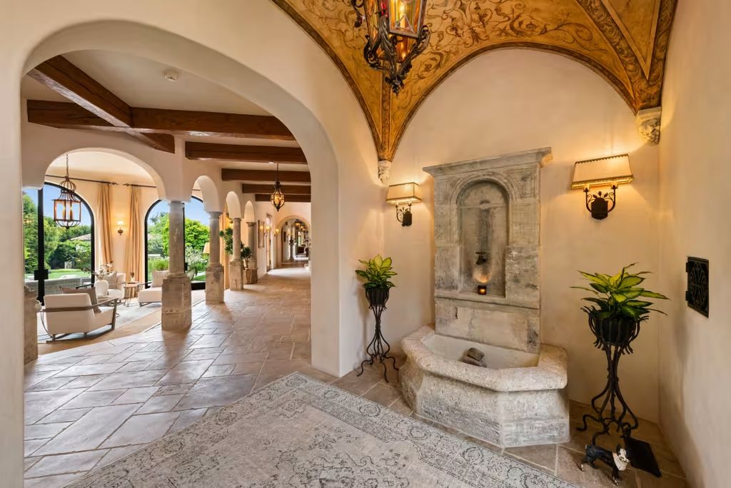 Additional interior amenities include a solarium, a cloistered living room, a screening room, a game room, a playroom, and a temperature-controlled wine cellar. According to information reviewed by californialuxuryhouses, the layout was intentionally designed to provide separation between public entertaining zones and more private living quarters—an increasingly important consideration for celebrity homeowners.