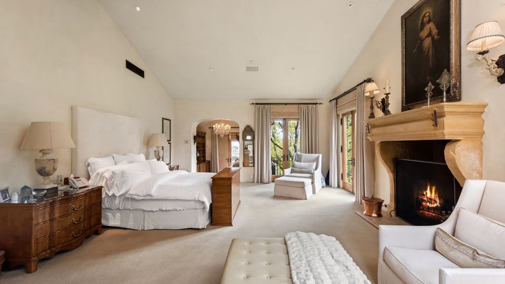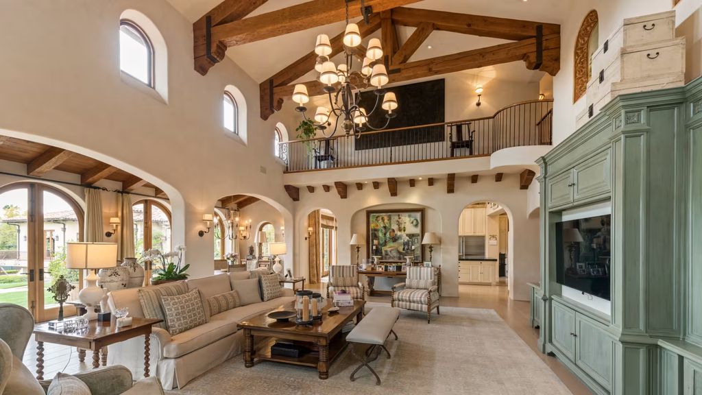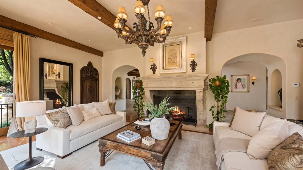 Inside, the eight-bedroom residence unfolds across a series of formal and informal spaces that reflect Landry’s signature approach to luxury living. Beamed ceilings, stone columns, and stately fireplaces lend the interiors a sense of gravitas, while generous room proportions allow the home to function equally well for large gatherings and everyday family life.