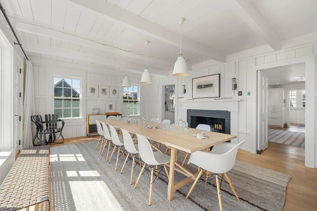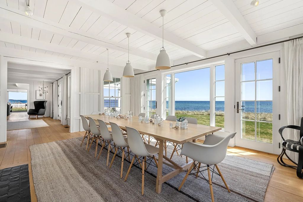 Professional-grade appliances, dual farmhouse sinks, and carefully positioned lighting ensure that the space performs at a high level while maintaining its visual clarity. The adjacent dining area continues this narrative, with a long natural wood table positioned against panoramic ocean views.