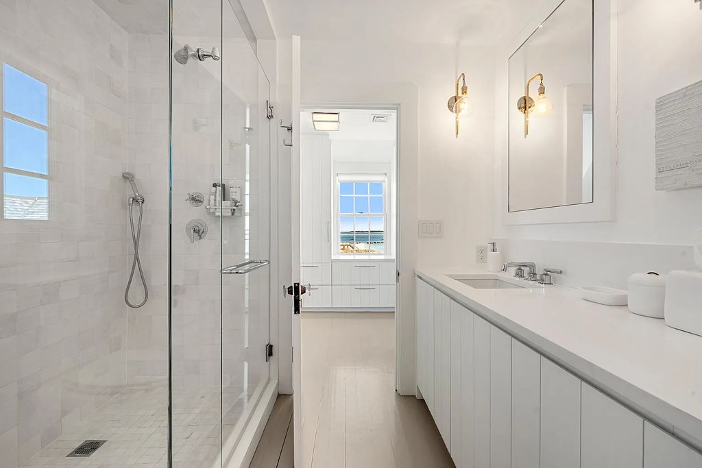 The primary suite within the Taylor Swift former Cape Cod estate sells for $12.3 million is defined by its connection to the surrounding landscape. Five oversized windows frame unobstructed views of Nantucket Sound, ensuring that the ocean remains an integral part of the living experience.