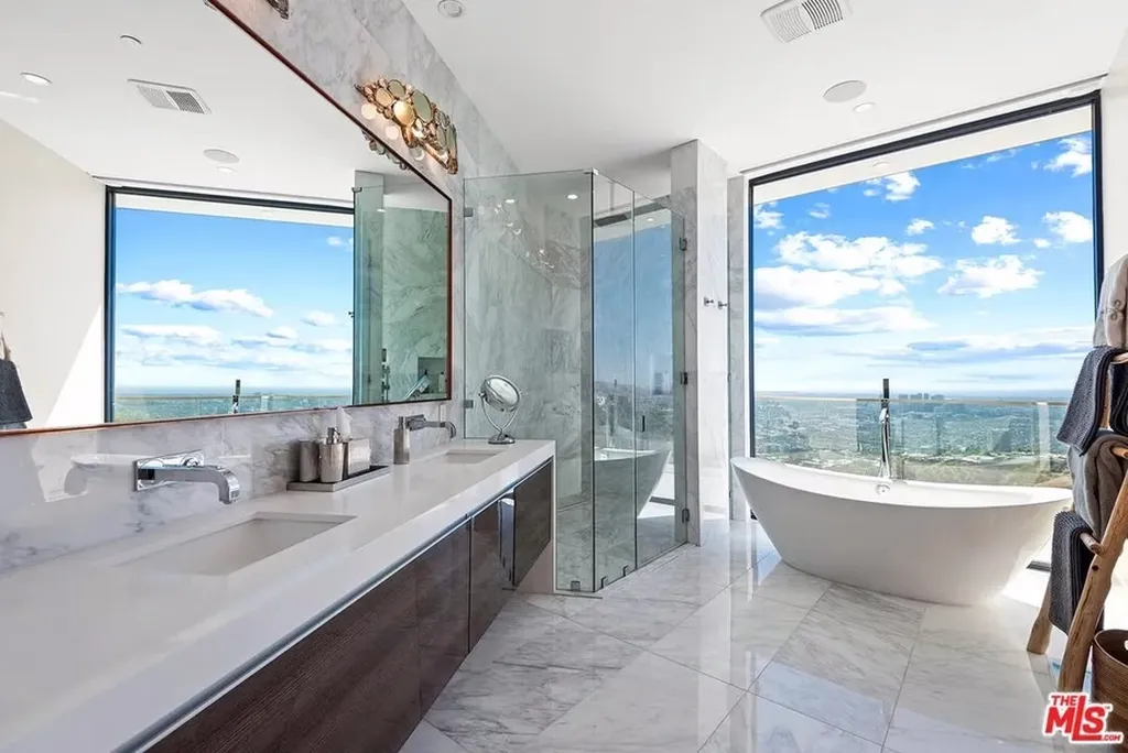- The Primary Sanctuary: Each of the five bedrooms is a full en-suite, but the primary suite is the architectural crown jewel. It features a private outdoor terrace patio and a bathroom that serves as a personal spa. Here, a large soaking tub is positioned strategically in front of a picture window, allowing the bather to overlook the lights of Downtown L.A. to the Pacific Ocean.