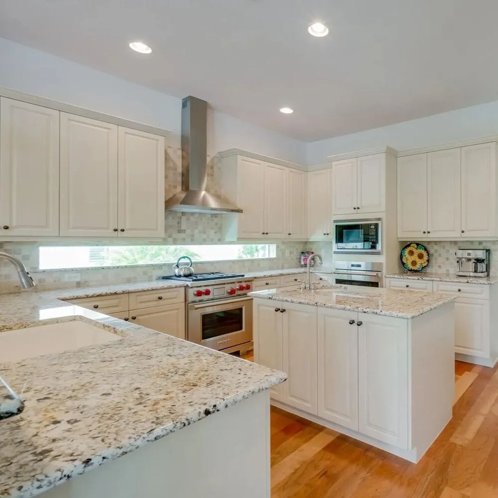 The heart of this home is the chef-style kitchen. A spacious island anchors the space, complemented by granite countertops and ample cabinet storage. Stainless steel appliances and a thoughtfully designed pantry support daily meal prep, while the breakfast nook overlooks the pool area—allowing easy flow between indoor and outdoor living. The kitchen balances elegance and practicality, fitting a household with active kids.