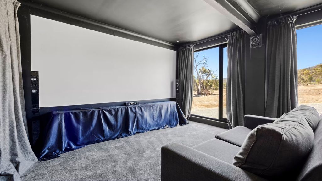 The residence includes four bedrooms, with the primary suite positioned to take full advantage of the surrounding landscape. Direct access to an expansive deck allows residents to move seamlessly between indoor and outdoor environments, reinforcing the property’s connection to nature. A dedicated home theater introduces a modern lifestyle element, ensuring that this shipping container home for sale in Australia delivers not only on design but also on comfort and entertainment.